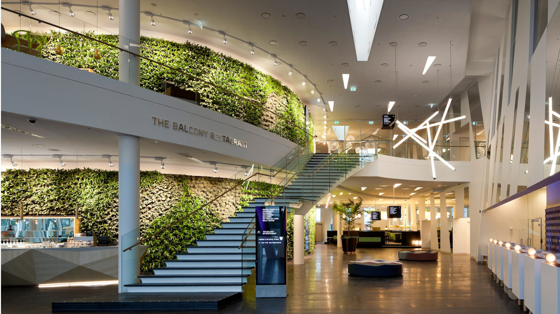 For example, at Bella Sky Hotel the building is optimized for people visiting and working. The hotel is a major employer and is the largest in the Nordic region, with more than 800 rooms and numerous meeting and activity spaces. Sustainable design features include a green living wall in the lobby bringing nature indoors, a ‘lazy’ social staircase to encourage people to walk and explore the building rather than always opting for the elevator, and a high performing building envelope7.